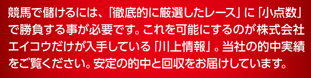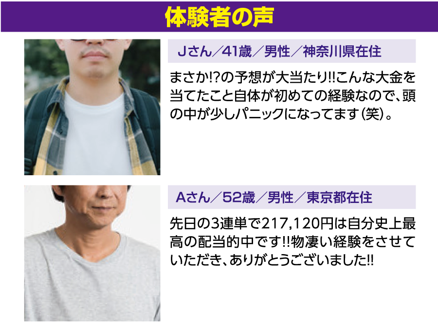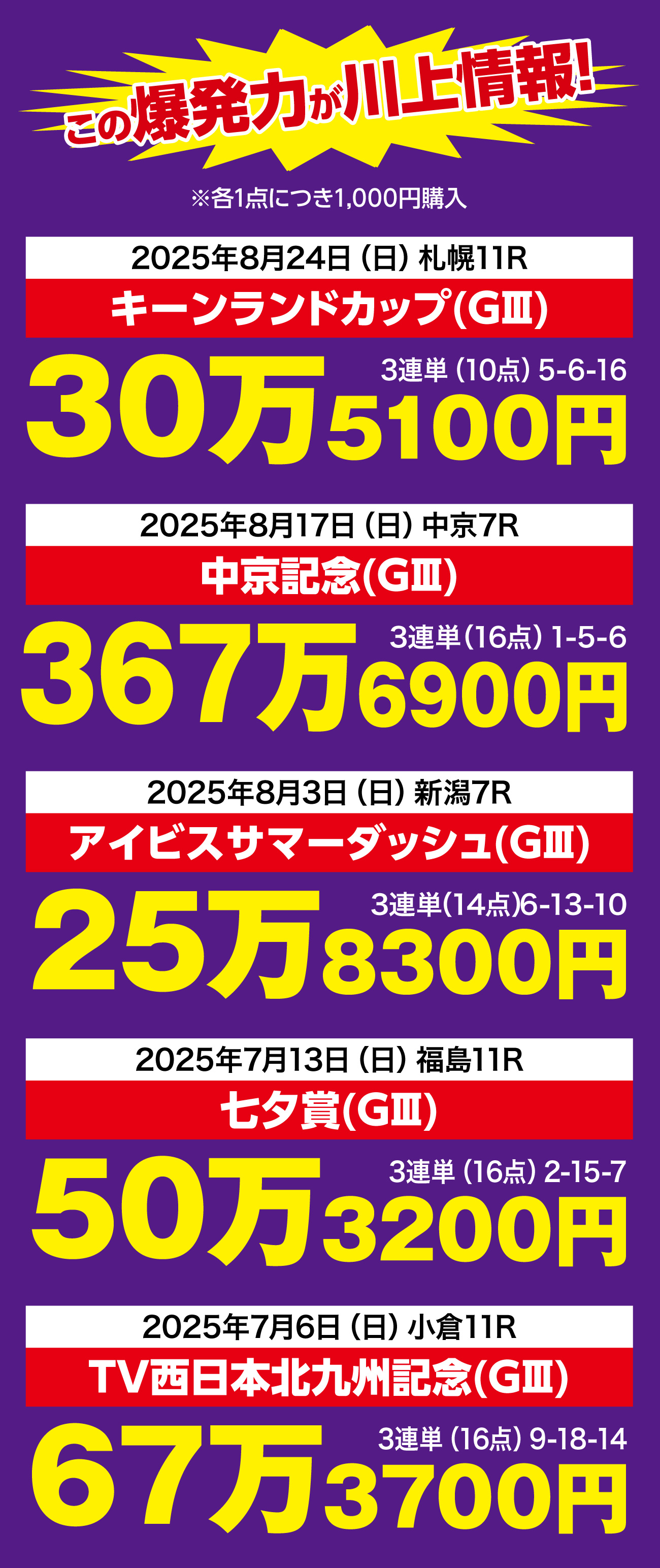 掲載の的中実績は、推奨の金額通りに購入していた場合の試算金額で掲載しております。レースの売上額やオッズ変動の関係で実際の払戻金額とは異なる可能性があります。